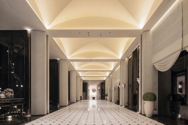 度假式艺术园林的造景,从约11米挑高的殿堂式大门开始,海洋元素的水景与全球首创的多立克贝壳柱,为珍贵海岸线之上的宅邸,雍容定调。在外围约400米的生活界面,复刻了香榭丽舍走廊的艺术元素,仿佛此刻就在巴黎漫步,生活日常与度假远行不再冲突。