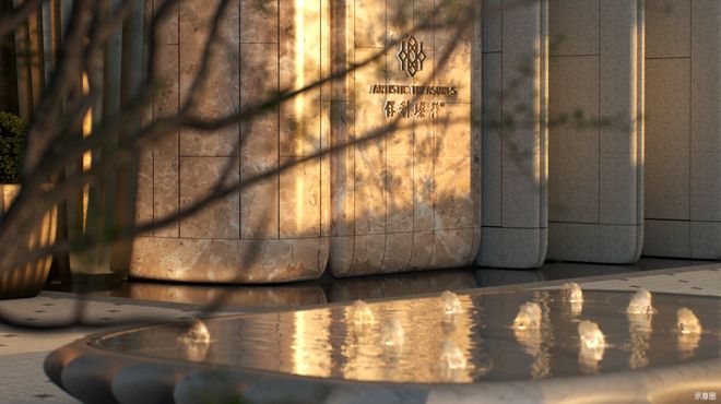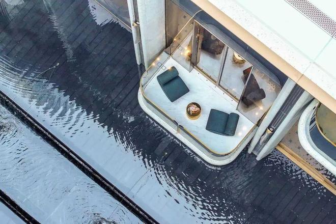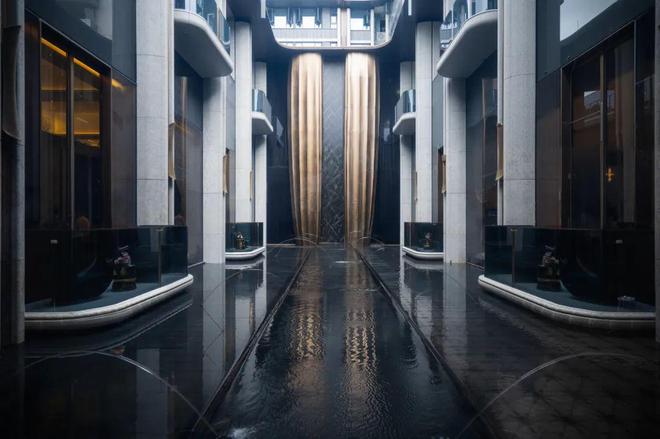 以“空中艺术剧院”的形制,将水景与廊柱艺术结合,增添了建筑的动态美感,这个设计十分巧妙,约10X10米的巨幅窗景,每一个廊柱的间隔空间,都是一处静听流水、放空身心的所在。