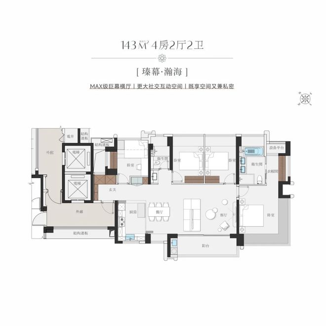 建面约143㎡4房2厅2卫的D2户型,横厅尺度近40㎡超大横厅,连通开合式岛台厨房,休闲会客空间十分阔绰。巨幕阳台面宽约7.6米,俯瞰海、岛、园、城的复合景观。主卧套间跟度假式酒店套房无异,双面飘窗周长约8.2米,主卫空间很大,浴缸和双台面洗漱池都能放得下。