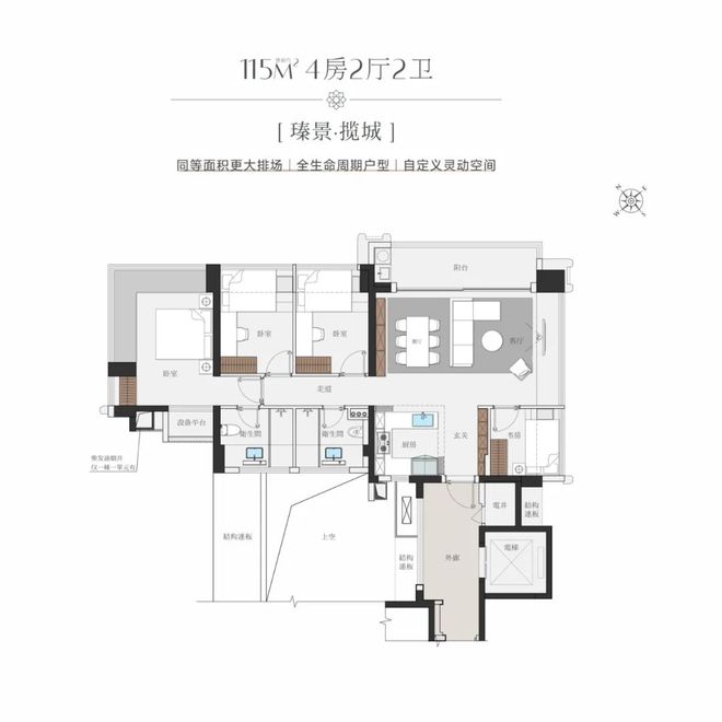 再来看看建面约115㎡的4房2厅2卫,这个尺度感根本看不出是百平出头的户型,实用面积可见一斑。宽约6米的一体化餐客厅,与厨房、书房之间是非承重墙隔断,空间可以灵活打开。除了超大面宽的阳台,还有一面宽幕飘窗采光,主卧也有一个270°的双面景观飘窗。