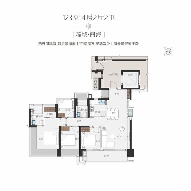 建面约123㎡4房2厅2卫,南向四开间看海,景观面约17.8米。一体化餐客厅,预留冰箱位,开合式岛台厨房,满足中西餐烹饪需求。一个南向次卧连通阳台,动线便利。主卧拥有独立衣帽间,且配置双面大飘窗视野,享受被海景环绕的起居体验。